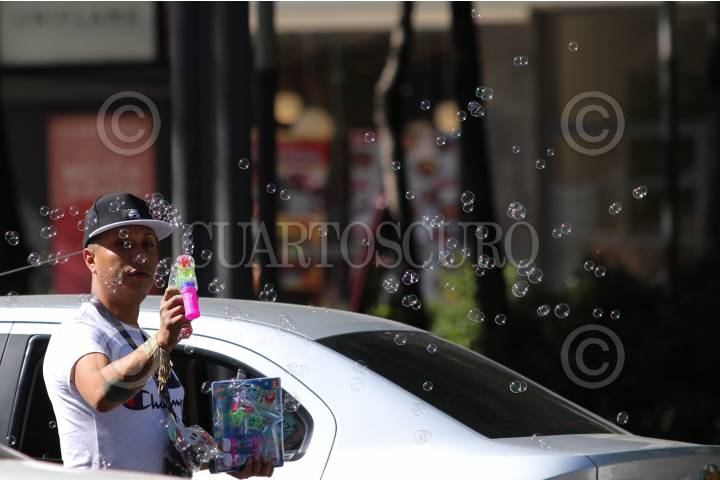 Un vendedor de burbujas de jabón ofrece sus productos en Avenida Reforma