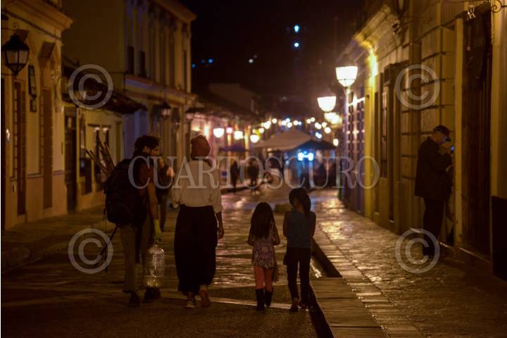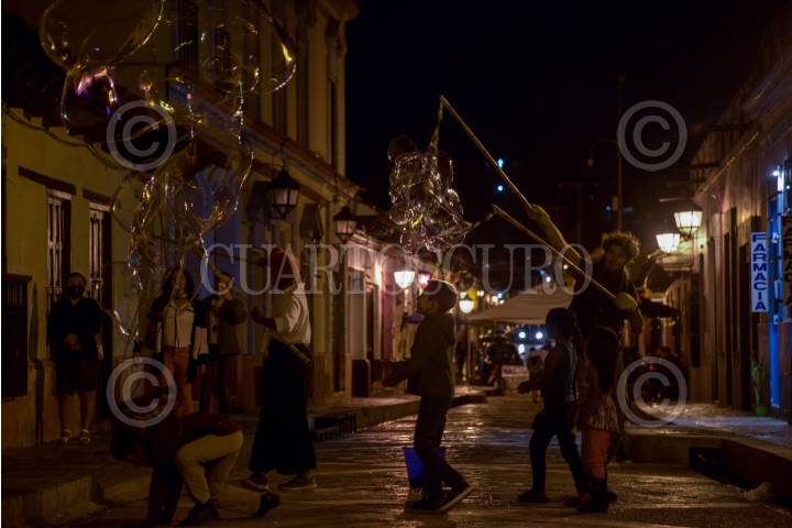 Escena cotidiana en el centro de la capital de Morelos, una vendedora de burbujas ofrece su mercancia.