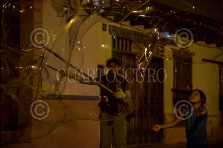 Artistas callejeros hacen burbujas gigantes en los andadores turísticos de la ciudad.