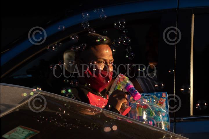 Una niña disfruta de unas burbujas desde un coche sobre avenida Reforma