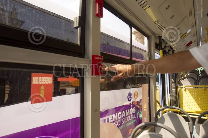 MONTERREY, NUEVO LEÓN, 13MARZO2020.- Diversas empresas de transporte urbano iniciaron una campaña contra el acoso en el transporte público con botones de pánico el cual las mujeres que sufran algún tipo de acoso podrán presionar el botón de pánico el cuál provocará que suene una alarma con luz de emergencia, el operador tiene la obligación de cerrar las puertas y llamar a las autoridades correspondientes. FOTO: GABRIELA PÉREZ MONTIEL / CUARTOSCURO.COM