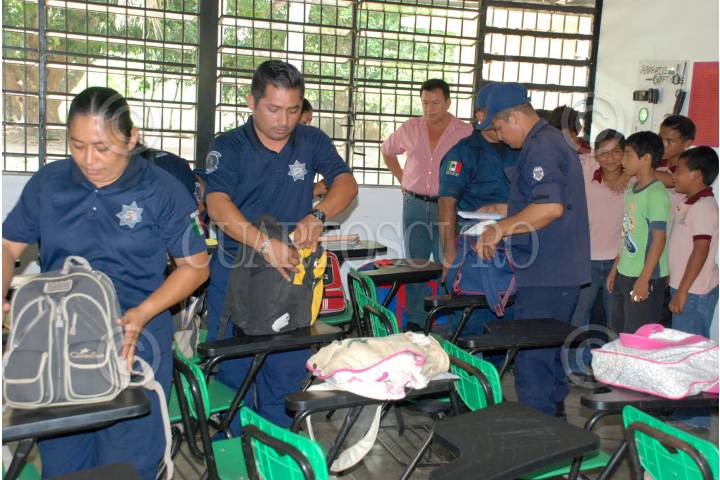 NACAJUCA, TABASCO, 03JUNIO2010.- La Dirección de la Policía municipal implementa de manera sorpresa un operativo en los distintos planteles educativos principalmente en primarias y secundarias públicas. Los uniformados revisan las mochilas de los escolares en busca de armas blancas o algún tipo de drogas. FOTO: MARCO POLO GUZMÁN HERNÁNDEZ/CUARTOSCURO.COM