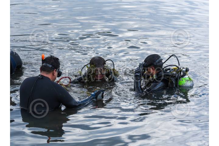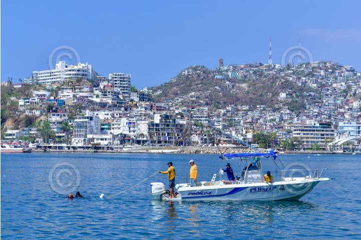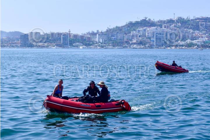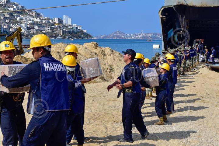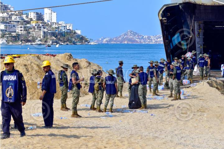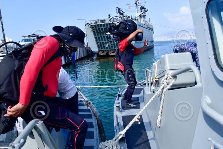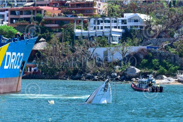 ACAPULCO, GUERRERO, 11NOVIEMBRE2023.- Agentes de la Marina realizan labores de rescate de embarcaciones hundidas y búsqueda de personas desaparecidas en el mar tras el paso del huracán Otis. Buzos especializados llevan acabo inmersiónes en las zonas de barcos para localizar cuerpos, mientras que con draga las sacan a flote para colocarlas en la bahía del puerto. A su vez, realizaron el desembarque de 80 toneladas de víveres para ser repartidos entre la población acapulqueña. FOTO: CARLOS ALBERTO CARBAJAL/CUARTOSCURO.COM