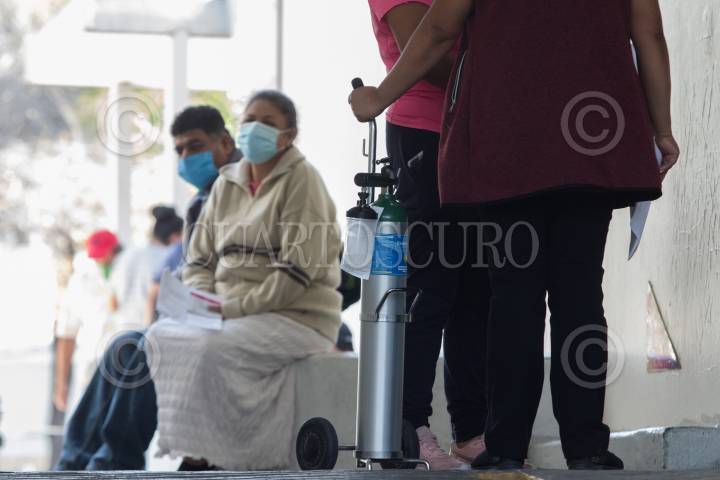 Familiares esperan con tanques de oxígeno medicinal que sus pacientes sean dado de altas en el área de urgencias Covid-19 del Hospital de los Venados IMSS.