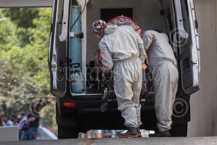 Paramédicos trasladan a un paciente con síntomas de Covid-19, al Hospital de los Venados IMSS.
