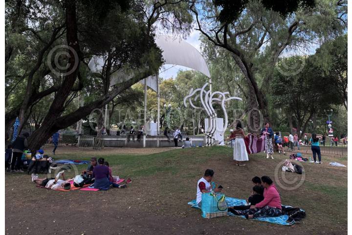 CIUDAD DE MÉXICO, 04MAYO2025.- Una familia come una paleta de hielo para refrescarse en los jardines del Centro Nacional de las Artes (Cenart). FOTO: MAGDALENA MONTIEL/CUARTOSCURO.COM