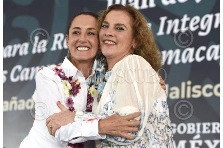 CAÑADAS DE OBREGÓN, JALISCO, 17AGOSTO024.- Claudia Sheinbaum Pardo, presidenta electa de México, y Beatriz Gutiérrez Müller, esposa del presidente, se abrazan durante el evento protocolario del Plan de Justicia para los Pueblos de Temacapulín, Acasico y Palmarejo, en la plaza cívica de Temacapulín. FOTO: PRESIDENCIA/CUARTOSCURO.COM