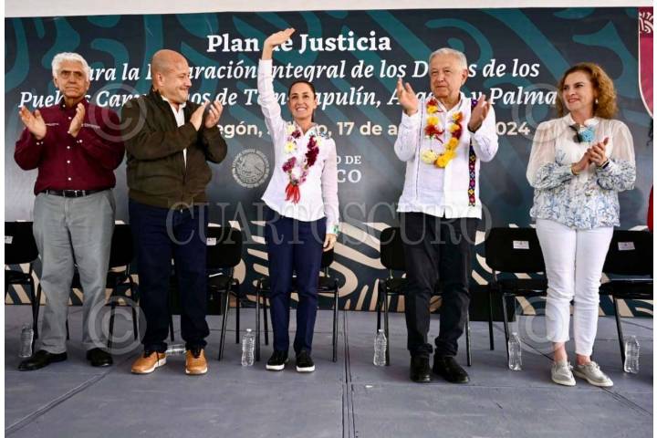 CAÑADAS DE OBREGÓN, JALISCO, 17AGOSTO024.- German Martínez Santoyo, director general de la Comisión Nacional del Agua; Enrique Alfaro, gobernador de Jalisco; Claudia Sheinbaum, presidenta electa de México; Andrés Manuel López Obrador, presidente de México, y Beatriz Gutiérrez Müller, esposa del presidente, encabezaron el evento protocolario del Plan de Justicia para los Pueblos de Temacapulín, Acasico y Palmarejo, en la plaza cívica de Temacapulín. FOTO: PRESIDENCIA/CUARTOSCURO.COM