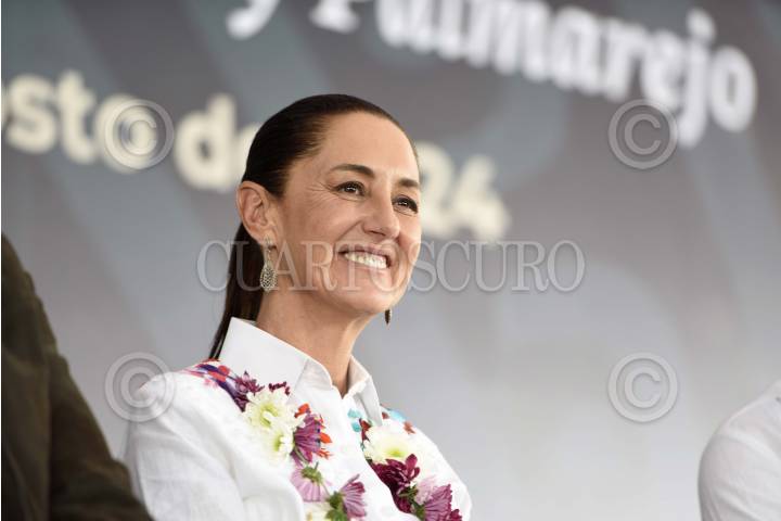 CAÑADAS DE OBREGÓN, JALISCO, 17AGOSTO024.- Claudia Sheinbaum, presidenta electa de México, sonríe durante el evento protocolario del Plan de Justicia para los Pueblos de Temacapulín, Acasico y Palmarejo, en la plaza cívica de Temacapulín. FOTO: PRESIDENCIA/CUARTOSCURO.COM