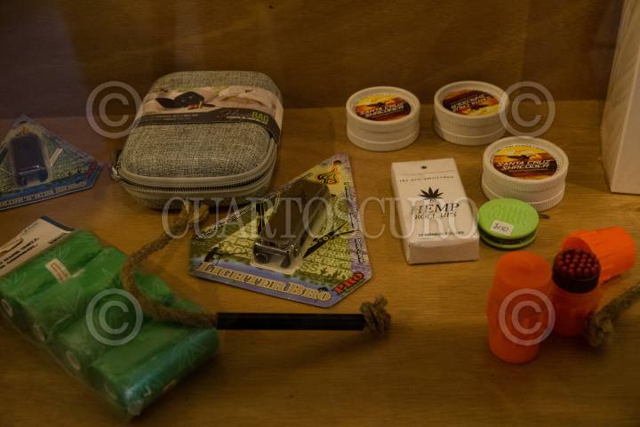 Exposición de algunos productos base cañamo que se encuentran al interior de La Juanita Coffeeshop.