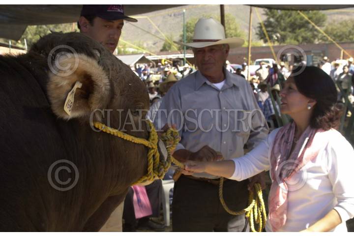 MUNICIPIO DE TABASCO, ZACATECAS, 26NOVIEMBRE2004.- Amalia García, gobernadora del estado entrega un toro semental pura sangre a un campesino de este municipio, como parte del programa de estímulos aplicado a la región de Los Cañones, con el fin de aumentar la producción de la ganadería y agricultura. FOTO: Pedro Valtierra/CUARTOSCURO.COM