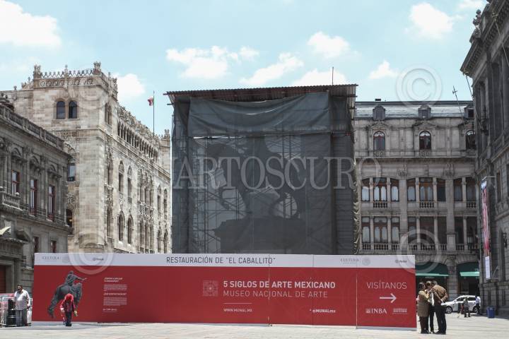 CIUDAD DE MÉXICO, 04JULIO2016.- Han iniciado el montaje de los andamios alrededor del Caballito de Plaza Tólsa, para comenzar con los trabajps de restauración después de casi dos años en donde fue estropeado durante trabajos de remozamiento. FOTO: ARMANDO MONROY /CUARTOSCURO.COM