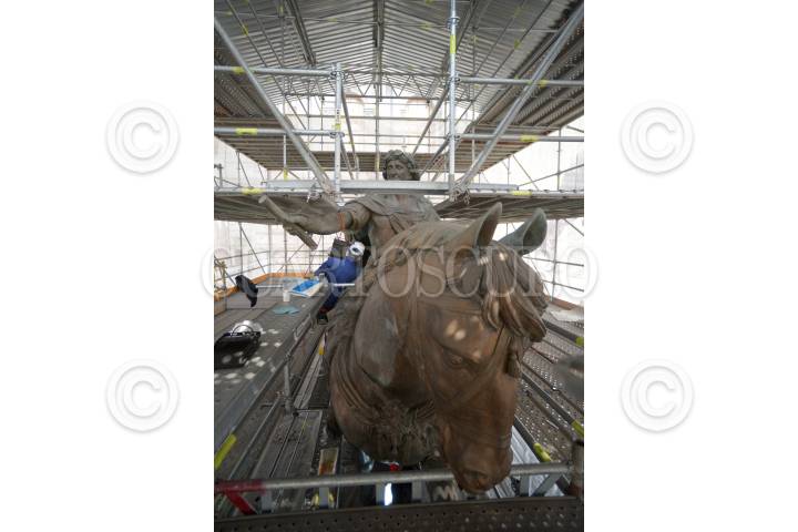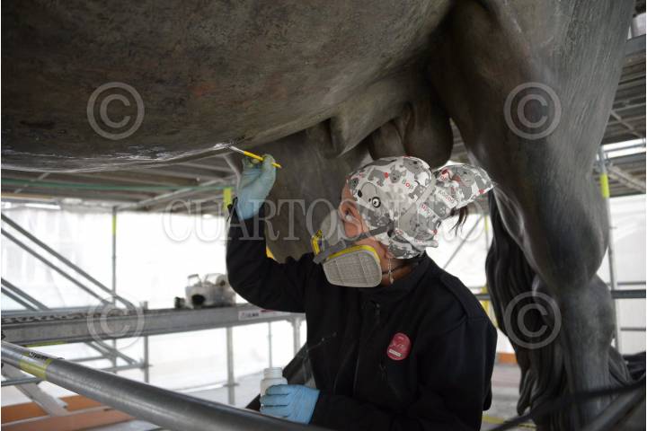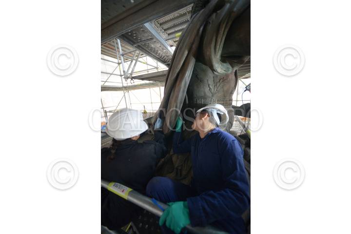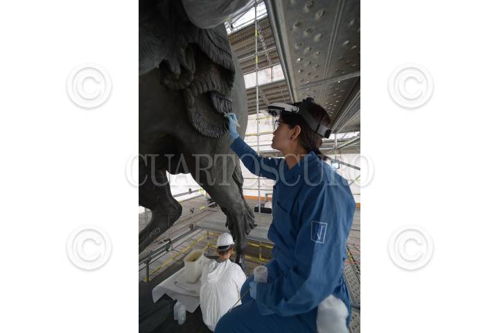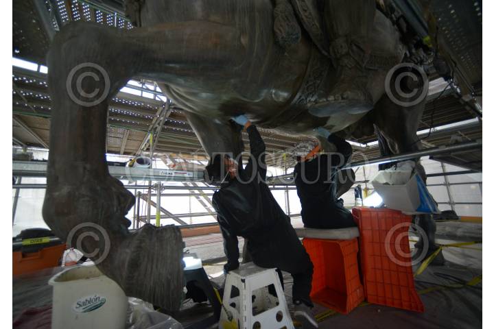 CIUDAD DE MÉXICO, 28JUNIO2017.- El proceso de restauración y conservación que permitió restituir de forma integral la escultura ecuestre de Carlos IV, mejor conocida como "El Caballito", quedó concluida después de más un año de trabajos, esto tras los daños que sufrió de una mala intervención de limpieza en el año 2013. El Instituto Nacional de Antropología e Historia dio a conocer que los expertos atendieron al monumento en su totalidad restaurando tanto la escultura metálica como el basamento y su pedestal. En la imagen durante las labores de restauración. FOTO: INAH /HÉCTOR MONTAÑO/CUARTOSCURO.COM