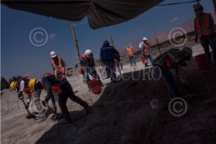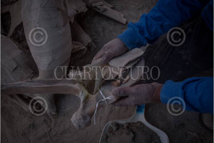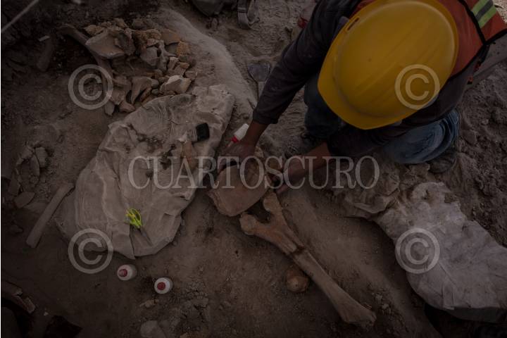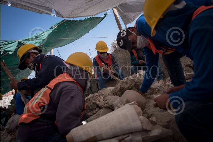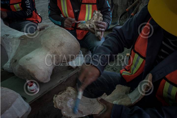 Trabajadores capacitados por personal del INAH, realizan las labores de extracción, cuidado y rescate de los huesos encontrados.