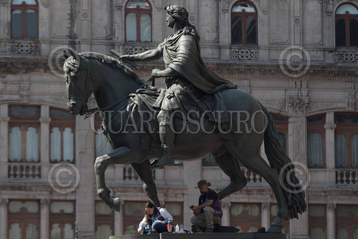 Un par de restauradores trabajan en la base de la Estatua Ecuestre de Carlos V (Caballito), frente al Munal.