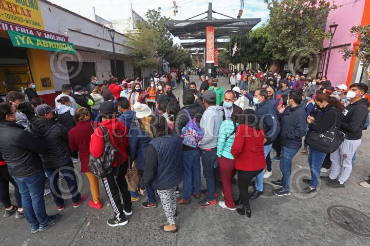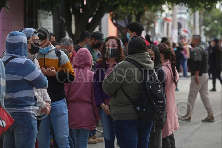 Decenas de personas se aglomeran esta mañana en la Plazoleta de la Infancia en el municipio de Tlaquepaque, para conseguir una de las pocas fichas que otorga al día el Gobierno del Estado para la realización de pruebas gratuitas contra el Covid-19.