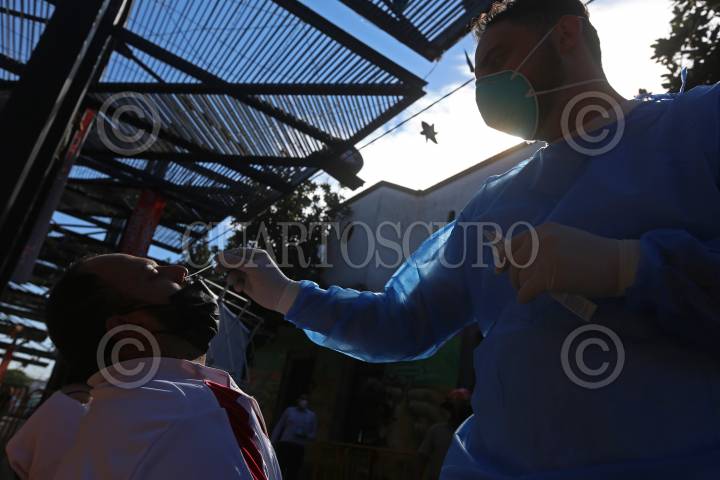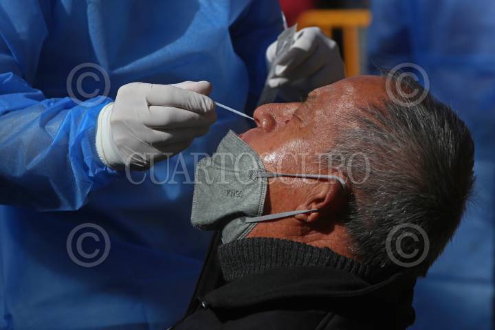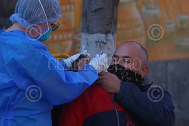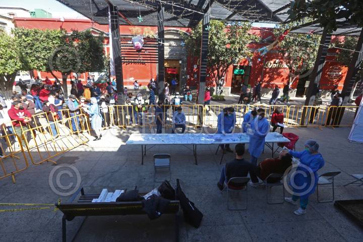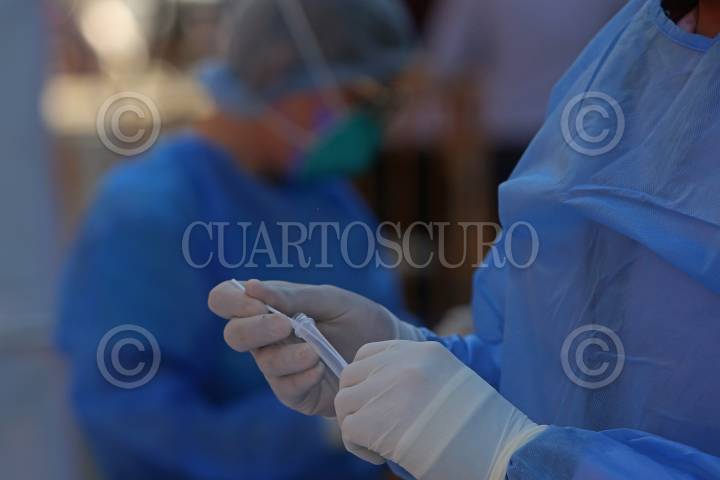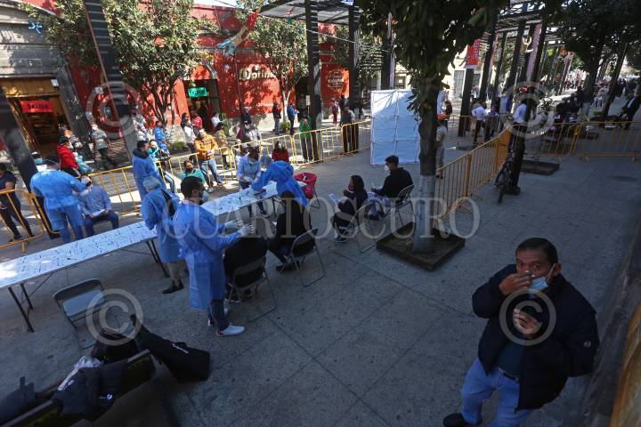 Personal de la Secretaría de Salud durante la realización de pruebas gratuitas contra el Covid-19, esta mañana en la Plazoleta de la Infancia en el municipio de Tlaquepaque.