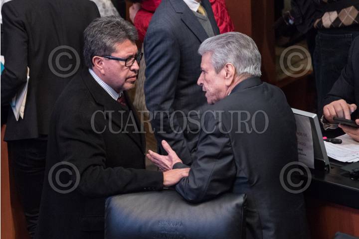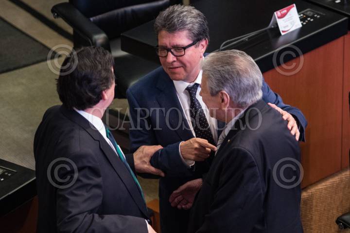 CIUDAD DE MÉXICO, 25OCTUBRE2018.- Ricardo Monreal Ávila, coordinador de los senadores de Morena, conversa con parte de su bancada durante la sesión ordinaria del Senado de la República. FOTO: MISAEL VALTIERRA /CUARTOSCURO.COM