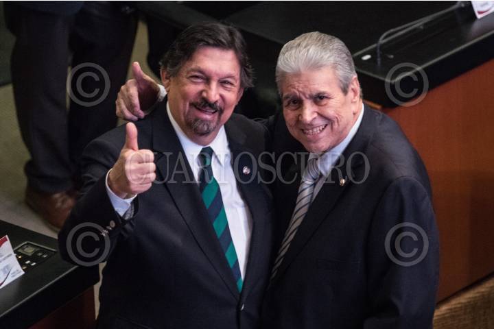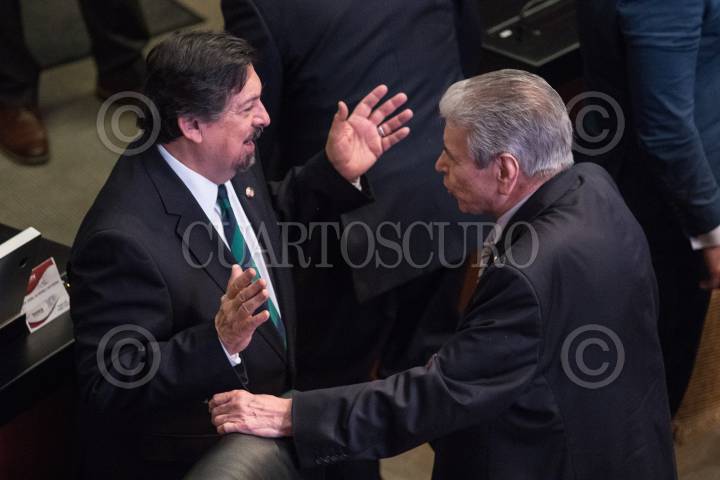 CIUDAD DE MÉXICO, 04DICIEMBRE2018.- El senador de Morena, Napoleón Gómez Urrutia y Carlos Aceves del Olmo, senador del PRI, conversan durante la sesión del pleno del Senado de la República. FOTO: MISAEL VALTIERRA /CUARTOSCURO.COM