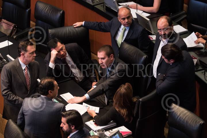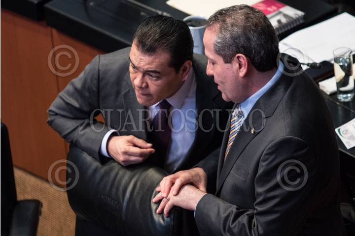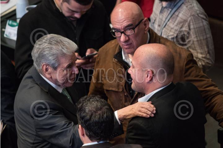 CIUDAD DE MÉXICO, 25OCTUBRE2018.- Los senadores por Morena, Germán Martínez y Alfonso Durazo, conversan con los senadores del Partido Revolucionario Institucional (PRI), Manuel Añorve y Eruviel Ávila, respetivamente, durante la sesión ordinaria del Senado de la República. FOTO: MISAEL VALTIERRA /CUARTOSCURO.COM