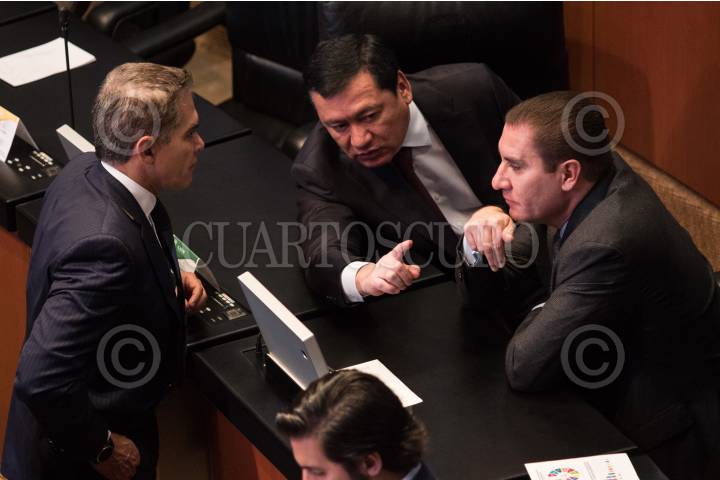 CIUDAD DE MÉXICO, 06DICIEMBRE2018.- Miguel Ángel Mancera, Miguel Ángel Osorio Chong y Rafael Moreno Valle, coordinadores parlamentarios del PRD, PRI y PAN, conversan durante la sesión plenaria del Senado de la República. FOTO: MISAEL VALTIERRA /CUARTOSCURO.COM