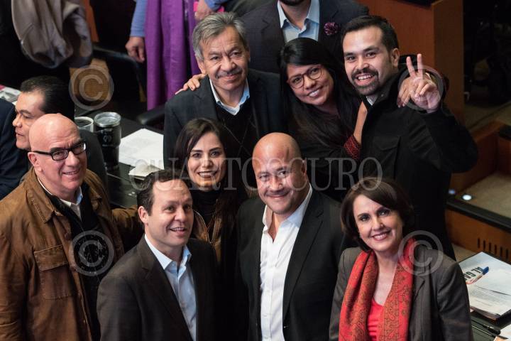 CIUDAD DE MÉXICO, 13DICIEMBRE2018.- Enrique Alfaro, gobernador de Jalisco e integrantes de la bancada del partido Movimiento Ciudadano, se toman fotografías durante su visita a la sesión del pleno del Senado de la República. FOTO: MISAEL VALTIERRA / CUARTOSCURO.COM