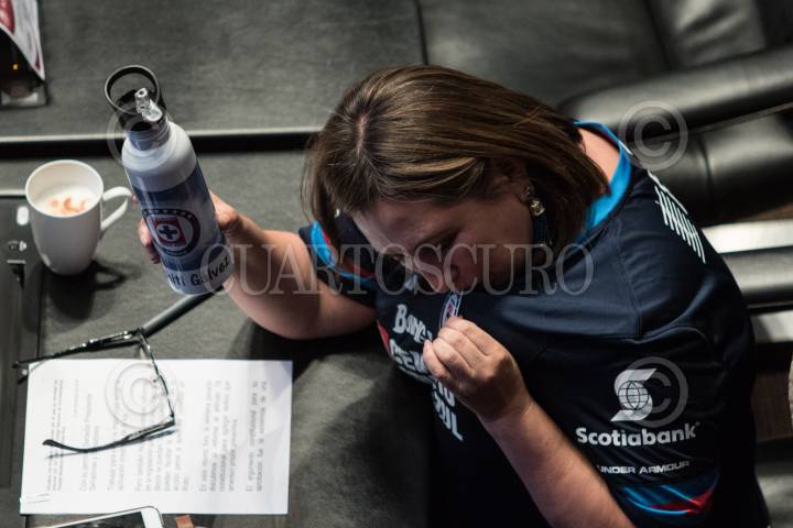 CIUDAD DE MÉXICO, 13DICIEMBRE2018.- Xóchitl Gálvez, senadora del PAN, besa la playera del Cruz Azul, quien jugará la final del torneo de liga de fútbol contra el América. FOTO: MISAEL VALTIERRA / CUARTOSCURO.COM