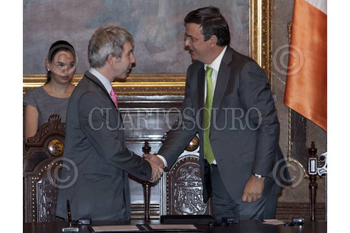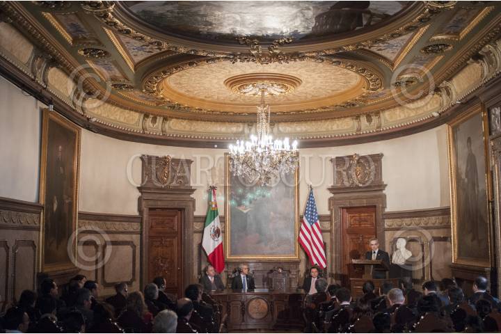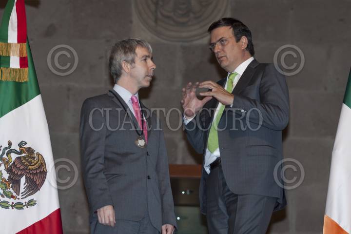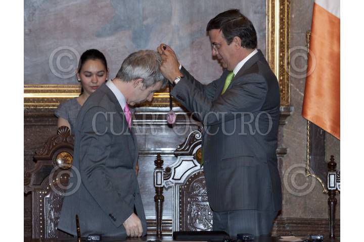 MÉXICO, D.F., 07MARZO2012.- Marcelo Ebrard, jefe de gobierno del Distrito Federal realizó la entrega de Medalla y Pergamino de Huésped Distinguido a Andrew Montague, alcalde de la ciudad de Dublin, Irlanda durante un acto en el Salón de los Cabildos del Antiguo Palacio del Ayuntamiento. FOTO: RODOLFO ANGULO /CUARTOSCURO.COM