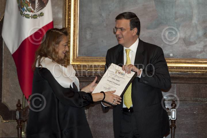 MÉXICO, D.F., 14MARZO2012.- La arquitecta Zaha Hadid recibió el Pergamino de Huésped Distinguido de parte de Marcelo Ebrard, jefe de gobierno del Distrito Federal en el Salón de los Cabildos del Antiguo Palacio del Ayuntamiento. FOTO: RODOLFO ANGULO /CUARTOSCURO.COM
