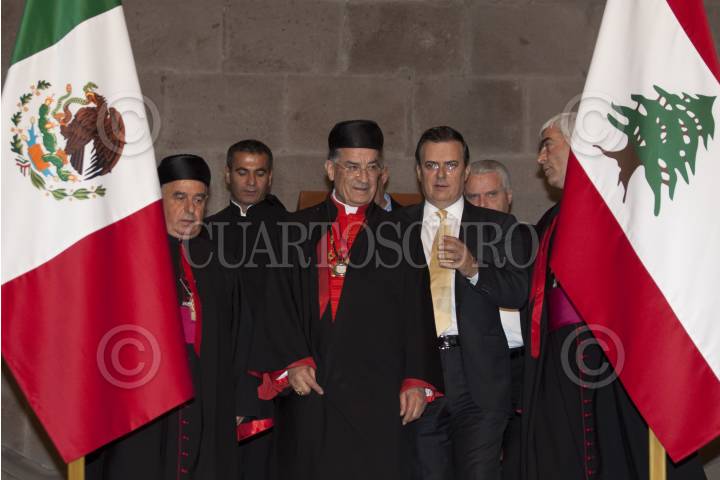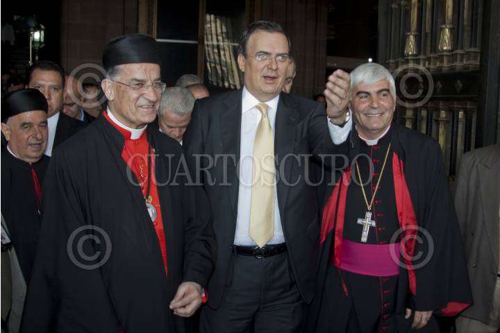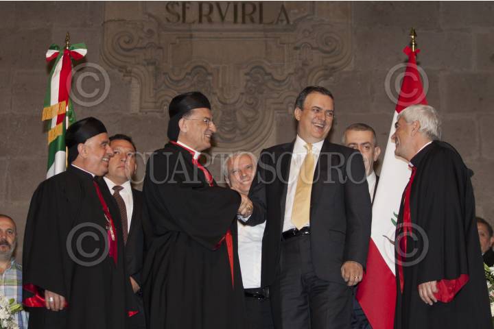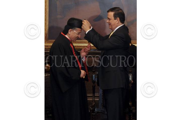MÉXICO, D.F., 02MAYO2012.- Marcelo Ebrard, jefe de gobierno del Distrito Federal hizo entrega de la medalla y pergamino de Huésped Distinguido a Bechara Boutros Rai, patriarca maronita de Antioquia y de todo Oriente durante un evento en el Salón de los Cabildos del Antiguo Palacio del Ayuntamiento. FOTO: RODOLFO ANGULO /CUARTOSCURO.COM