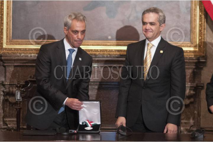 MÉXICO D.F., 14NOVIEMBRE2013.- Miguel Ángel Mancera, jefe de gobierno del Distrito Federal, recibió al alcalde de Chicago Rahm Emmanuel en el Salón de Cabildos del Antiguo Palacio del Ayuntamiento donde lo nombró huésped distinguido de la capital del país. FOTO: IVÁN STEPHENS /CUARTOSCURO.COM