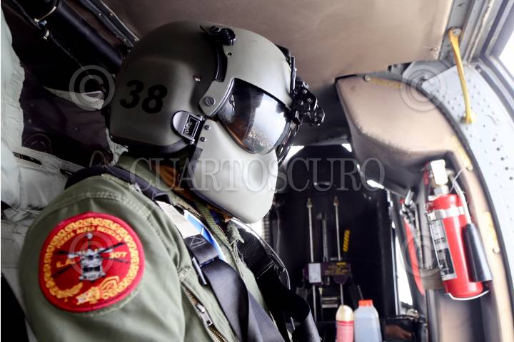 CIUDAD DE MÉXICO, 16SEPTIEMBRE2023.- Un miembro de la tripulación de un UH-60 Black Hawk durante su participación en el desfile militar por el 213 aniversario del Inicio de la Independencia Nacional, despegando de la Base Aérea Militar Nº 1 Santa Lucia. FOTO: EDGAR NEGRETE LIRA/CUARTOSCURO.COM
