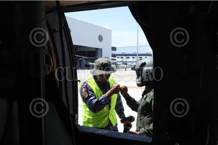 CIUDAD DE MÉXICO, 16SEPTIEMBRE2023.- Tripulante y un elemento de un UH-60 Black Hawk se despiden previo a su participación en el desfile militar por el 213 aniversario del Inicio de la Independencia Nacional, despegando de la Base Aérea Militar Nº 1 Santa Lucia. FOTO: EDGAR NEGRETE LIRA/CUARTOSCURO.COM