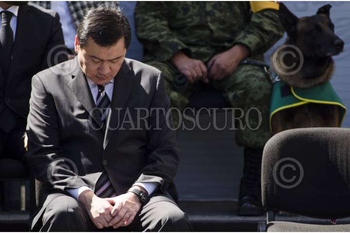 MÉXICO, D.F., 08FEBRERO2013.- Miguel Ángel Osorio Chong, Secretario de Gobernación, cabizbajo durante un homenaje a las 37 victimas de la explosión en el edificio B2 de la Torre de PEMEX, el cual se llevó acabo en las instalaciones de la paraestatal. FOTO: MISAEL VALTIERRA / CUARTOSCURO.COM