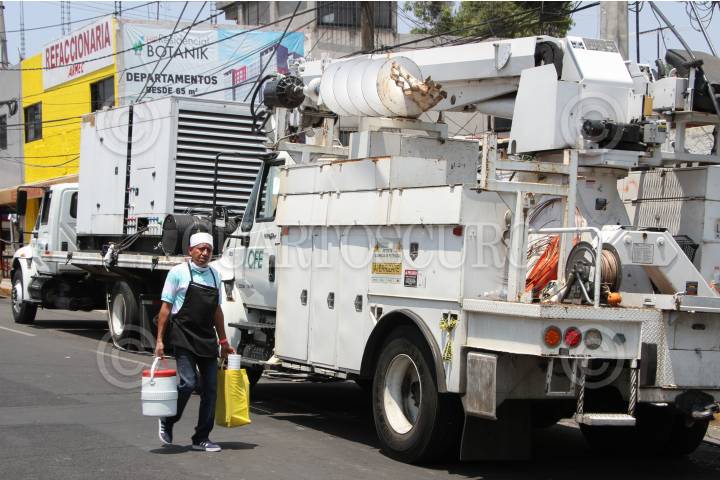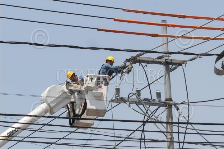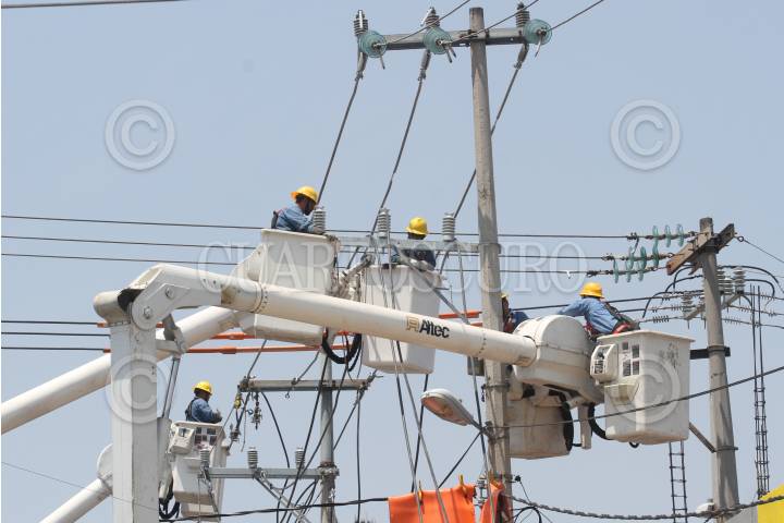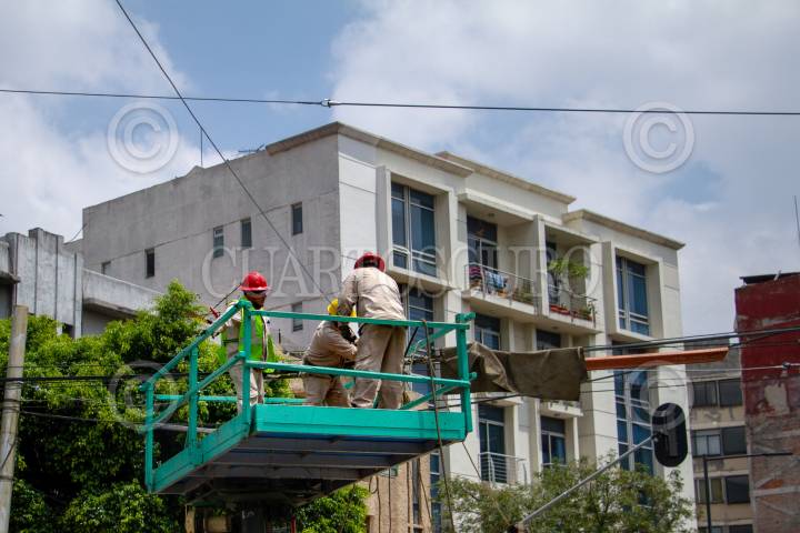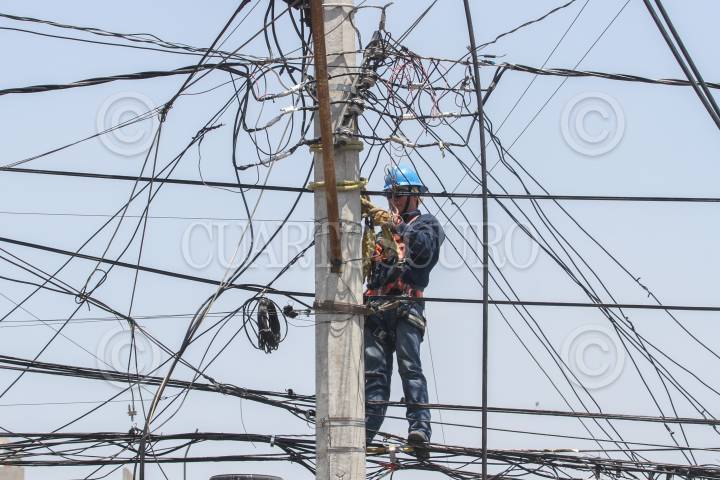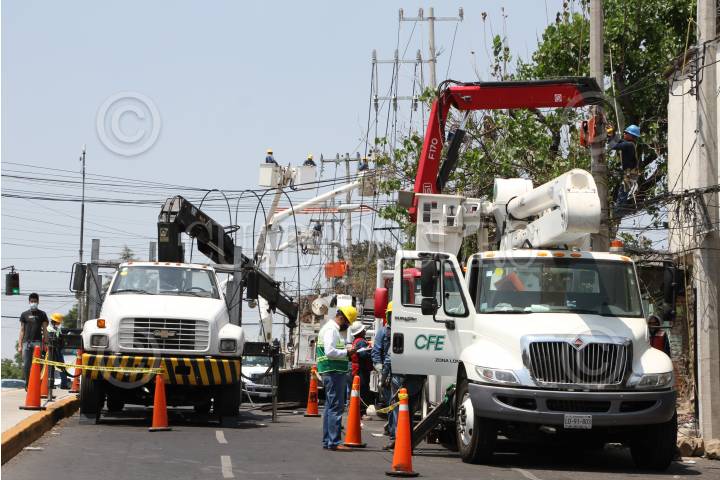 Trabajadores de la CFE realizando cambio de cableado en plateros.
