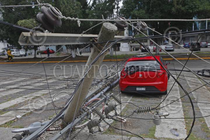 Trabajadores de la CFE cambian el cableado de un poste en la colonia Condesa.