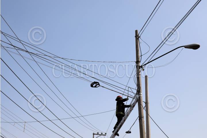 TLALNEPANTLA, EDOMEX, 17FEBRERO2025.- Un bombero del Estado de México retira un cable de luz que fue arrancando por un tráiler. FOTO: DANIEL AUGUSTO/ CUARTOSCURO.COM