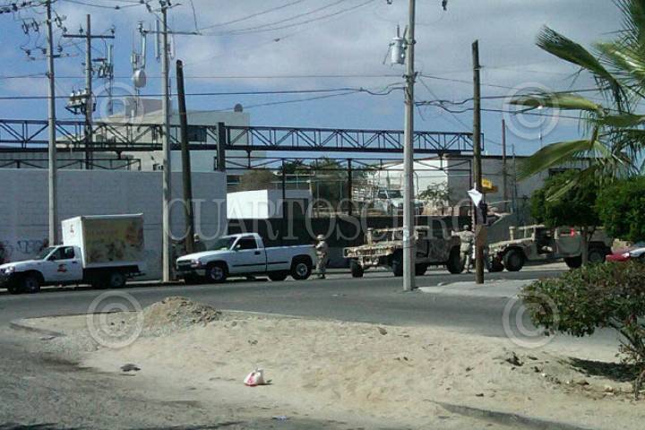 CABO SAN LUCAS, BAJA CALIFORNIA, 29OCTUBRE2011.- La Segunda balacera del día de hoy en Cabo San Lucas ocurrió en uno de los más importantes centros comerciales de Los Cabos y en medio de cientos de civiles. Los disparos se escucharon en la zona de Soriana – Plaza Sendero y muchos clientes se escondieron en el interior de los negocios y cerraron las puertas. Mientras que en Soriana muchos clientes salieron por la puerta de atrás, otros -clientes y empleados- quedaron encerrados mientras afuera militares y delincuentes se disparaban mutuamente. Policías y militares bloqueaban la zona, y después se escucharon disparos muy cerca de ahí, en el interior de la colonia Arcos del Sol, en la zona donde se encuentra el Hospital nuevo. Sin embargo, los policías comenzaron a registrar minuciosamente en el interior de Soriana y Plaza Sendero, por lo que se pensaba que había delincuentes escondidos en esos lugares. FOTO: twitter