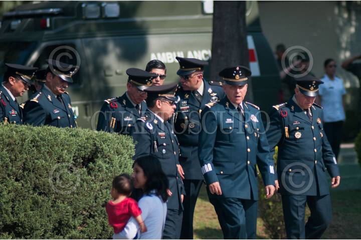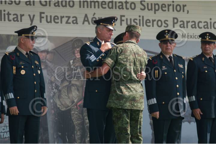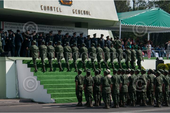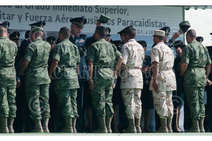 MÉXICO, D.F., 18ABRIL2015.- El general Salvador Cienfuegos Zepeda, secretario de la Defensa Nacional, encabezó la ceremonia de imposición de ascensos al grado inmediato superior, de 112 cabos de las armas, policía militar y fuerza aérea fusileros paracaidistas. Durante el evento, la banda de música del ejército y fuerza aérea mexicanos interpretó varios temas musicales. FOTO: DIEGO SIMÓN SÁNCHEZ /CUARTOSCURO.COM