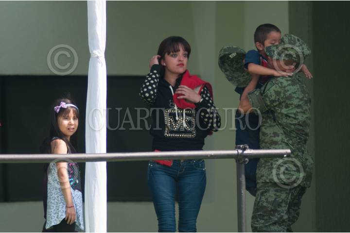 MÉXICO, D.F., 18ABRIL2015.- Elementos del ejército mexicano conviven con sus familias al termino de la ceremonia de imposición de ascensos al grado inmediato superior de 112 cabos de las armas, policía militar y fuerza aérea fusileros paracaidistas. Durante el evento, la banda de música del ejército y fuerza aérea mexicanos interpretó varios temas musicales. FOTO: DIEGO SIMÓN SÁNCHEZ /CUARTOSCURO.COM