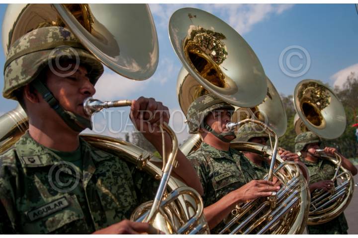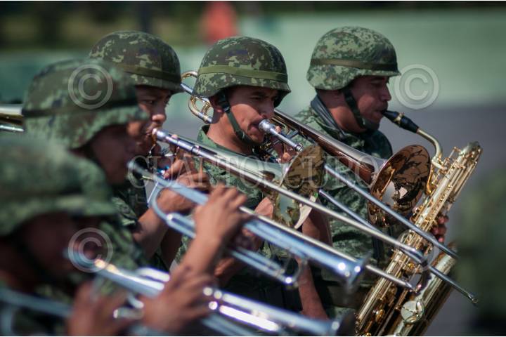 MÉXICO, D.F., 18ABRIL2015.- Banda de música del ejército y fuerza aérea mexicanos durante una ceremonia de imposición de ascensos al grado inmediato superior, de 112 cabos de las armas, policía militar y fuerza aérea fusileros paracaidistas. FOTO: DIEGO SIMÓN SÁNCHEZ /CUARTOSCURO.COM