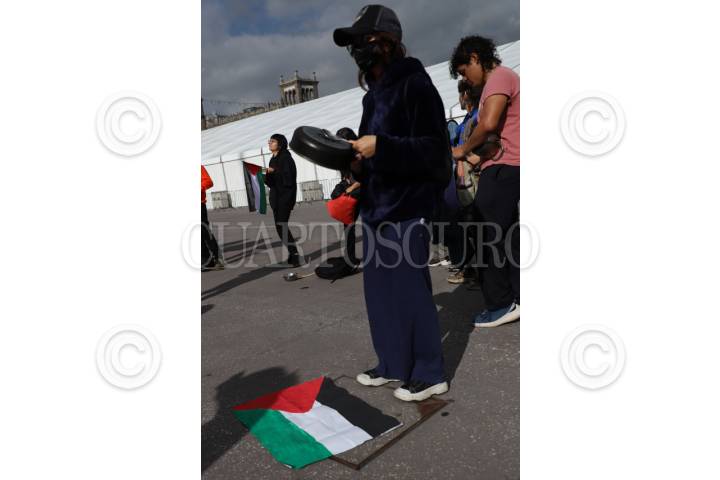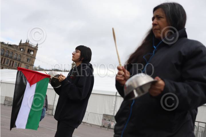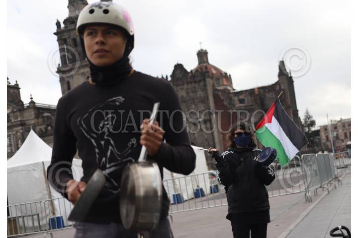 CIUDAD DE MÉXICO, 30JULIO2025.- Esta mañana, integrantes de colectivos en apoyo a Palestina realizaron un cacerolazo frente a Palacio Nacional. Durante la protesta, exigieron a la presidenta de México, Claudia Sheinbaum, romper relaciones diplomáticas con Israel, en rechazo a las acciones militares israelíes en Gaza. FOTO: DANIEL AUGUSTO / CUARTOSCURO.COM