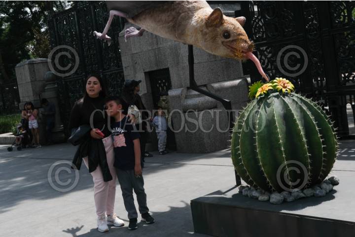CIUDAD DE MÉXICO, 25MARZO2024.- En el marco del inicio de las vacaciones de Semana Santa, un niño acompañado de su madre se tomaron una fotografía junto a la instalación de murciélagos en la entrada del Bosque de Chapultepec. FOTO: GRACIELA LÓPEZ /CUARTOSCURO.COM