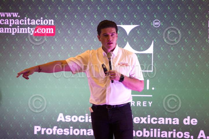 Samuel García, candidato a la gubernatura de Nuevo León, acudió a un encuentro con empresarios del sector inmobiliario del estado. García aclaró en rueda de prensa, que es el candidato puntero a un mes de la elección y tanto los partidos tradicionales o el Presidente no están implicados en su campaña.