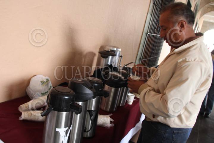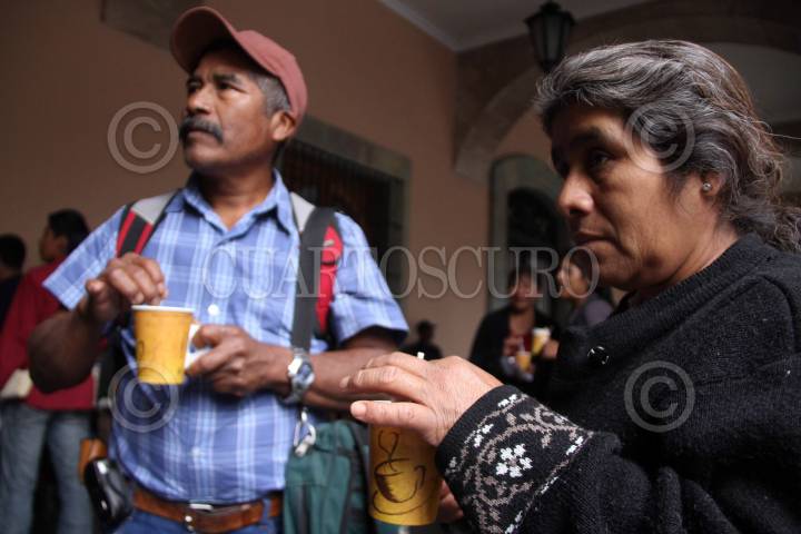 OAXACA, OAXACA., 10AGOSTO2012.- Cafeticultores pertenecientes a la Asociación de Sistema Producto Café protestaron regalando café en el corredor del Palacio de Gobierno, exigieron al gobernador, Gabino Cué cumpla con sus promesas de campaña y apoye a este sector. Los productores acusaron además la falta de apoyos luego del paso del huracán Carlota el pasado 15 de junio. FOTO: ARTURO PÉREZ ALFONSO /CUARTOSCURO.COM
