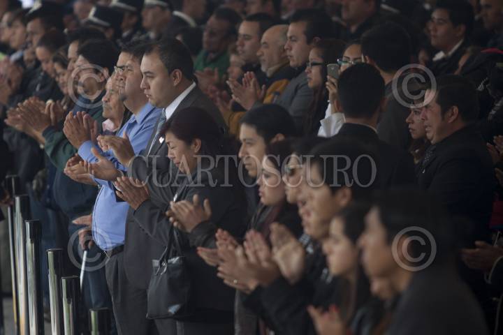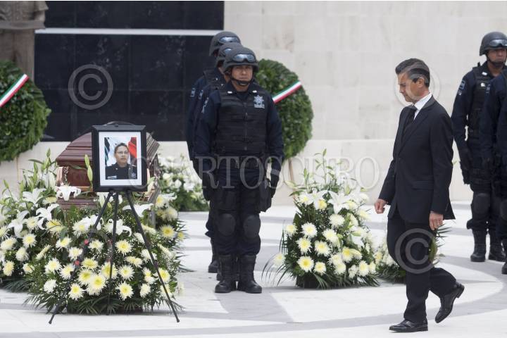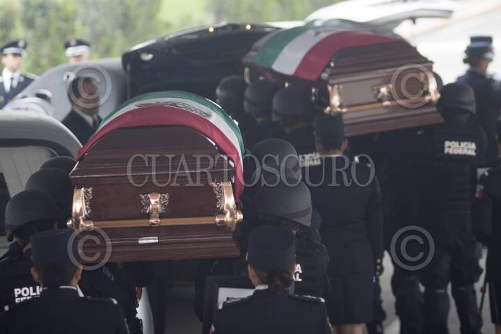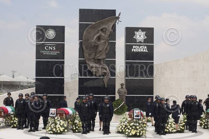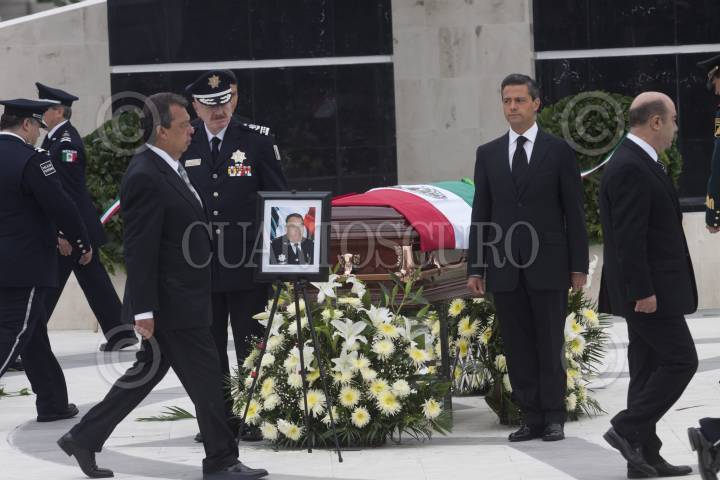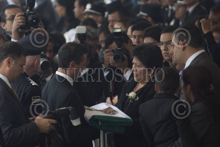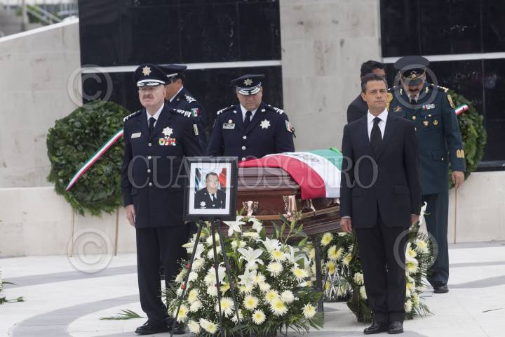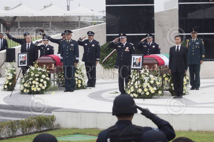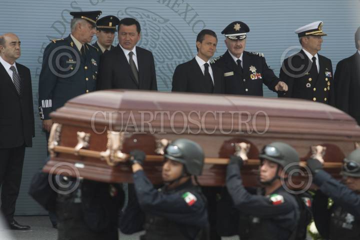 MÉXICO, D.F., 25SEPTIEMBRE2013.- Enrique Peña Nieto, Presidente de México, encabezó el homenaje a los cinco policías federales que murieron abordo de un helicóptero Black Hawk, donado por el gobierno estadounidense en el marco del Plan Mérida, durante los operativos que realizaba la Secretaría de Seguridad Pública Federal de ayuda a los damnificados en Guerrero por las lluvias provocadas por los meteoros Ingrid y Manuel. La tripulación estaba integrada por Isaac Escobar Bustamente, Julio César Zarco Castro, Enrique Briseño Martínez y Desidero Rosaso Zárate y José Ramón Peláez Prado. FOTO: MOISÉS PABLO /CUARTOSCURO.COM
