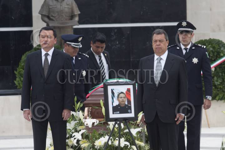 MÉXICO, D.F., 25SEPTIEMBRE2013.- Miguel Ángel Osorio Chong, secretario de Gobernación y Ángel Aguirre Rivero, durante el homenaje a los cinco policías federales que murieron abordo de un helicóptero Black Hawk, donado por el gobierno estadounidense en el marco del Plan Mérida, durante los operativos que realizaba la Secretaría de Seguridad Pública Federal de ayuda a los damnificados en Guerrero por las lluvias provocadas por los meteoros Ingrid y Manuel. La tripulación estaba integrada por Isaac Escobar Bustamente, Julio César Zarco Castro, Enrique Briseño Martínez y Desidero Rosaso Zárate y José Ramón Peláez Prado. FOTO: MOISÉS PABLO /CUARTOSCURO.COM