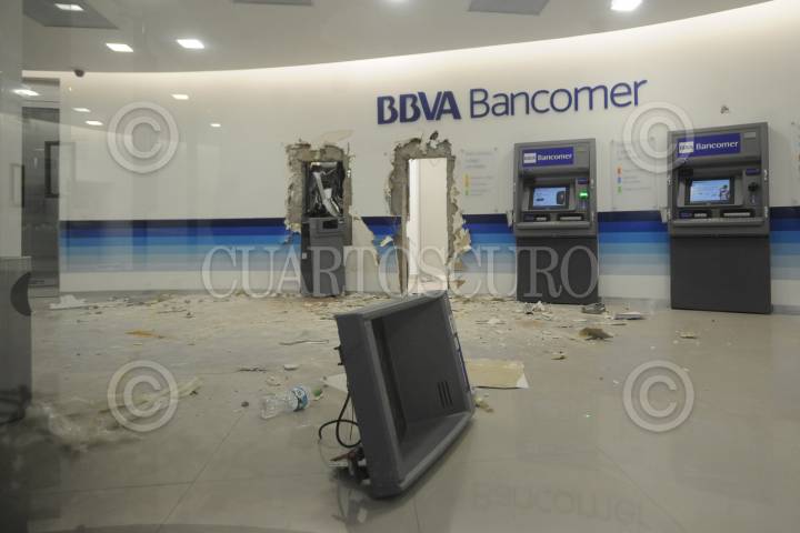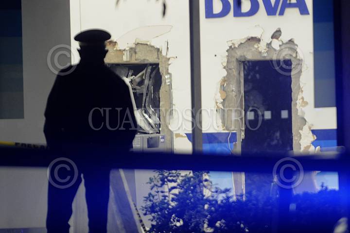 NAUCALPAN, ESTADO DE MÉXICO, 25MARZO2013.- Un cajero robado y dos más dañados de la sucursal BBVA Bancomer, ubicada en avenida Circuito Geógrafos y Circuito Médicos de Ciudad Satélite fue el saldo del saqueo de aproximadamente 10 sujetos encapuchados que fueron captados por las cámaras de vigilancia de esta sucursal captando el momento en que los ladrones sacan los cajeros de su base de concreto apoyados con barretas durante unos 20 minutos sin que fueran molestados por elementos policíacos que tienen su modulo a una calle del lugar. En el lugar fue abandonada la barreta de hierro que fue utilizada para robar dichos cajeros. FOTO: LUIS CARBAYO /CUARTOSCURO.COM