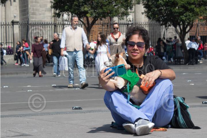 CIUDAD DE MÉXICO, 03NOVIEMBRE2019.- Una mujer se toma una fotografía frente a la Catedral de la Ciudad con su mascota disfrazada de calabaza. FOTO: MAGDALENA MONTIEL /CUARTOSCURO.COM