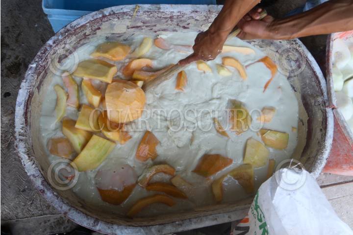 Un trabajador mueve las calabazas con cal para su proceso de dulce cristalizado, en Santa Cruz Alcapixca
